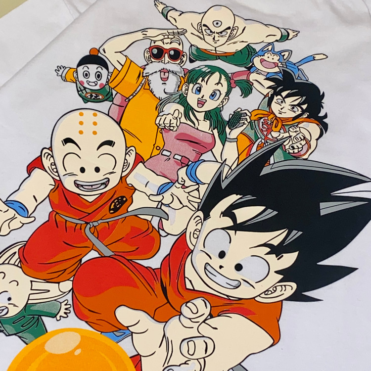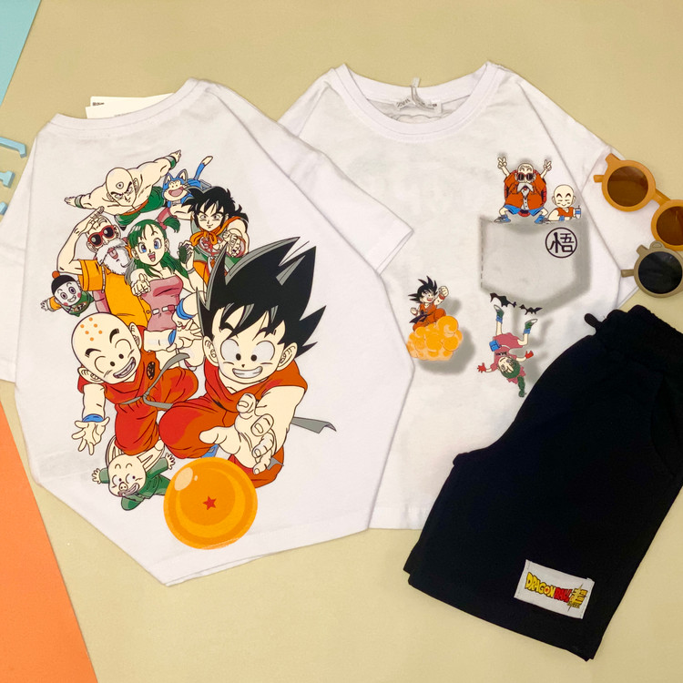 بلوز سفید با چاپ رنگی شخصیتهایی مثل گوكو، کریلین، بولما، مستر روشی و دیگر قهرمانهای معروف، همراه با شلوارک مشکی با لوگوی Dragon Ball – کاملاً مناسب بازی، گردش یا حتی مهمونیهای کودکانه!