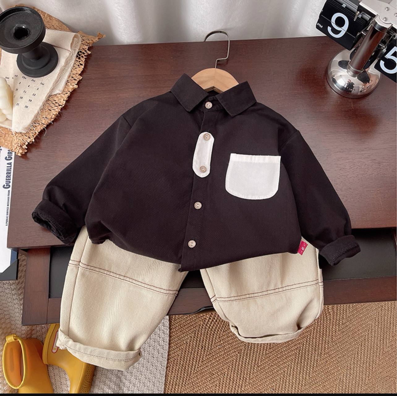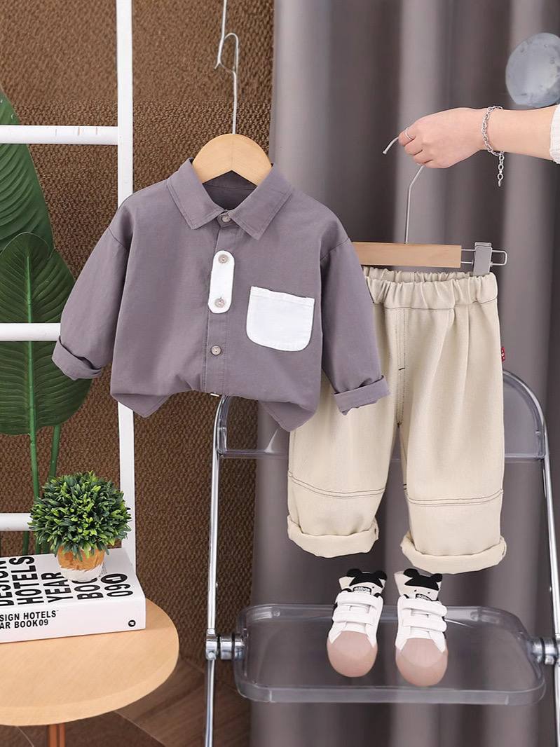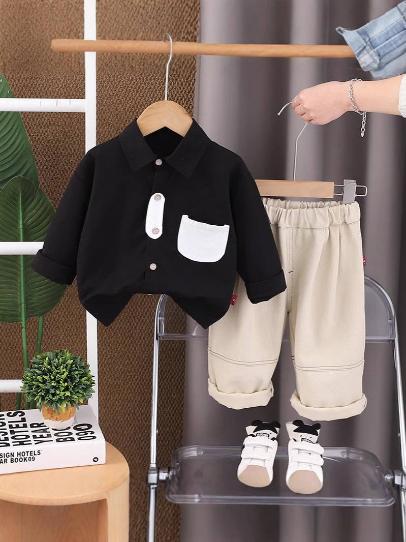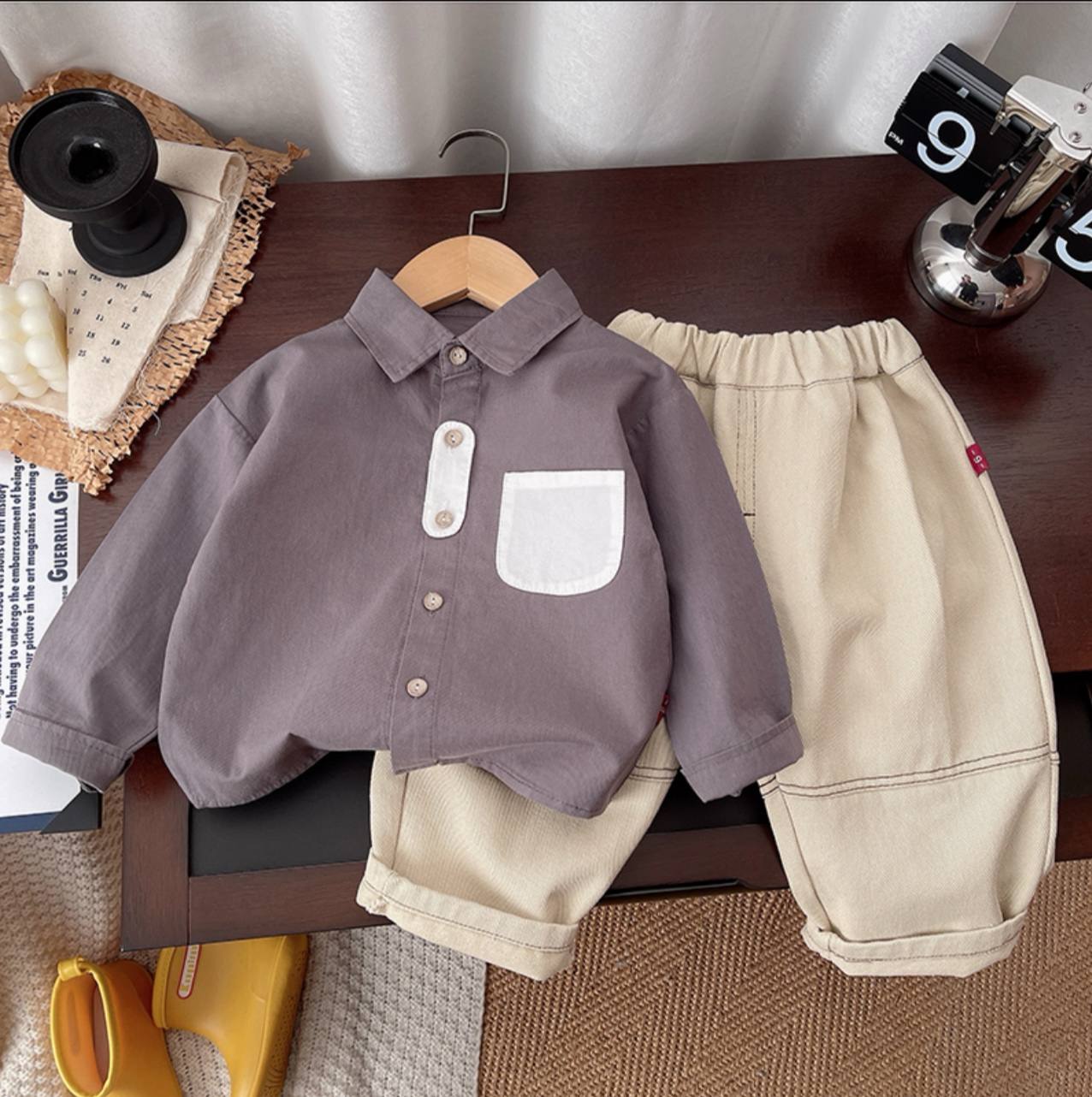 ست پسرانه بسیار شیک و مینیمال شامل پیراهن یقه دار دکمه ای با جیب سفید و شلوار کرم روشن با کمر کشی . ترکیب رنگ خنثی و طراحی ساده این ست ، آن را به انتخابی عالی برای مهمانی ها ، عکاسی ، عید دیدنی و استایل های رسمی و نیمه رسمی تبدیل کرده است.
