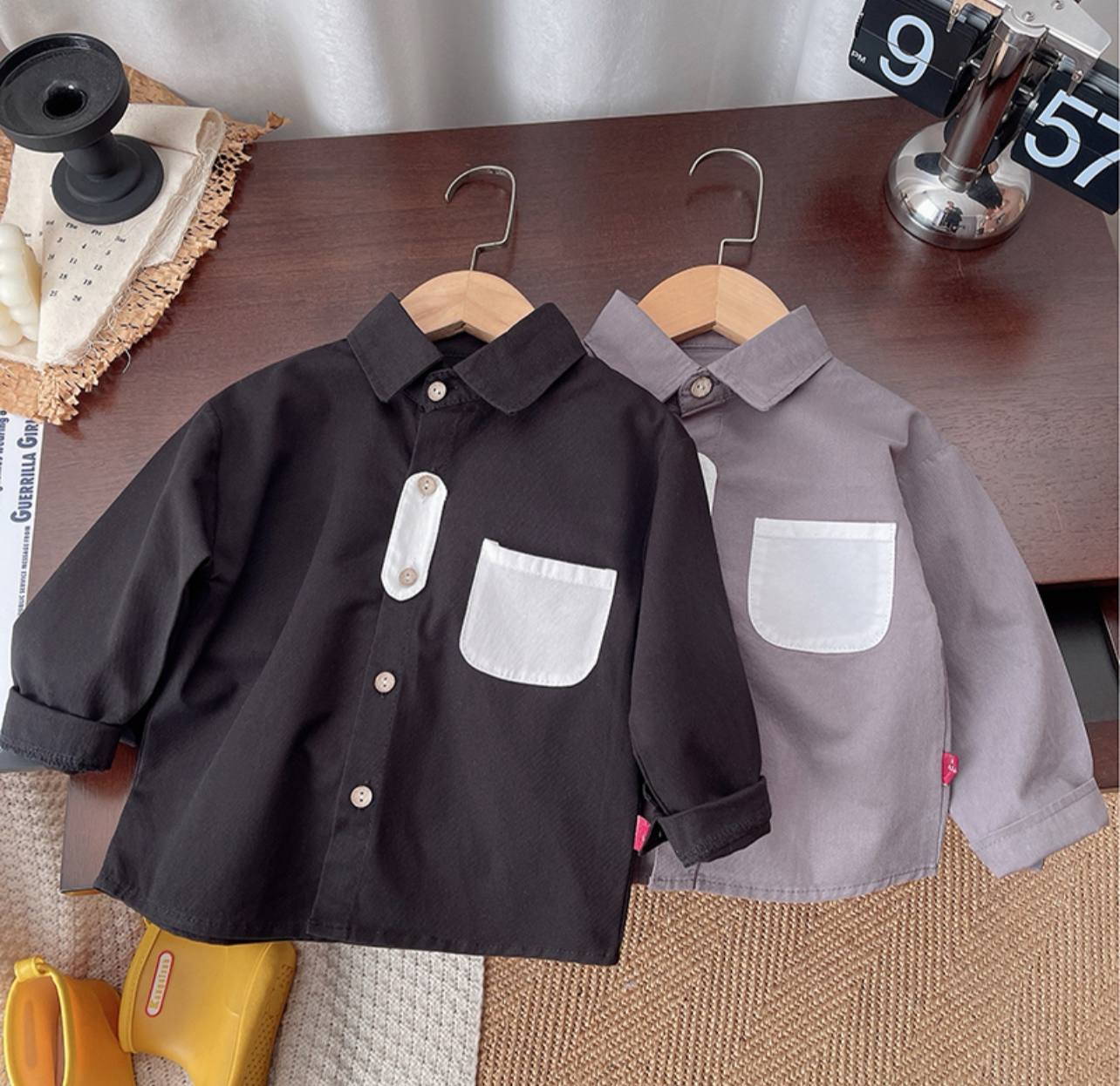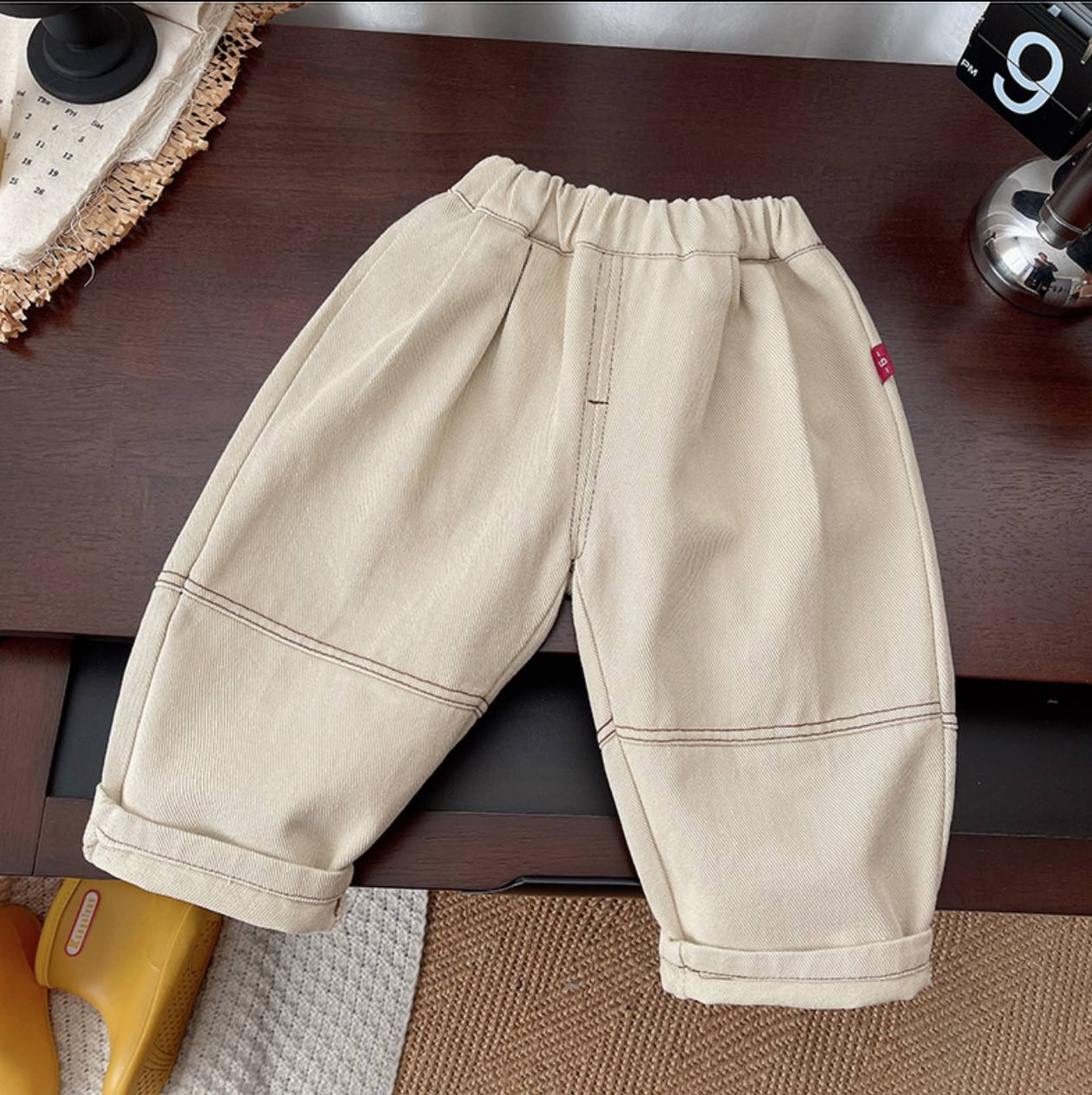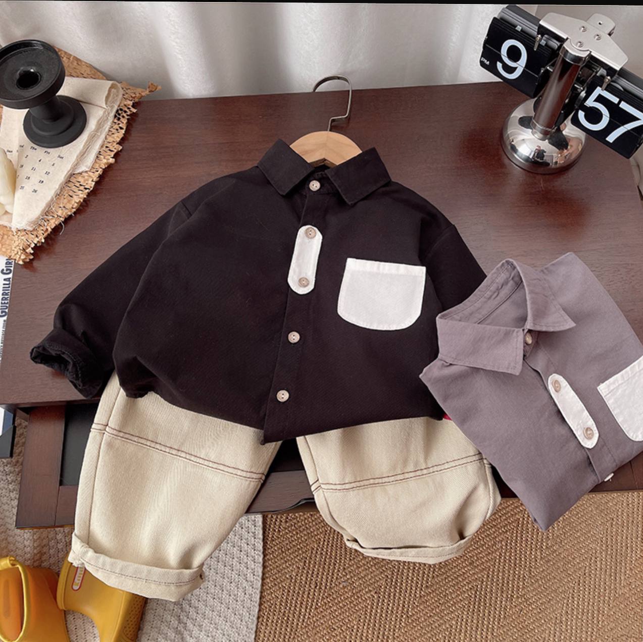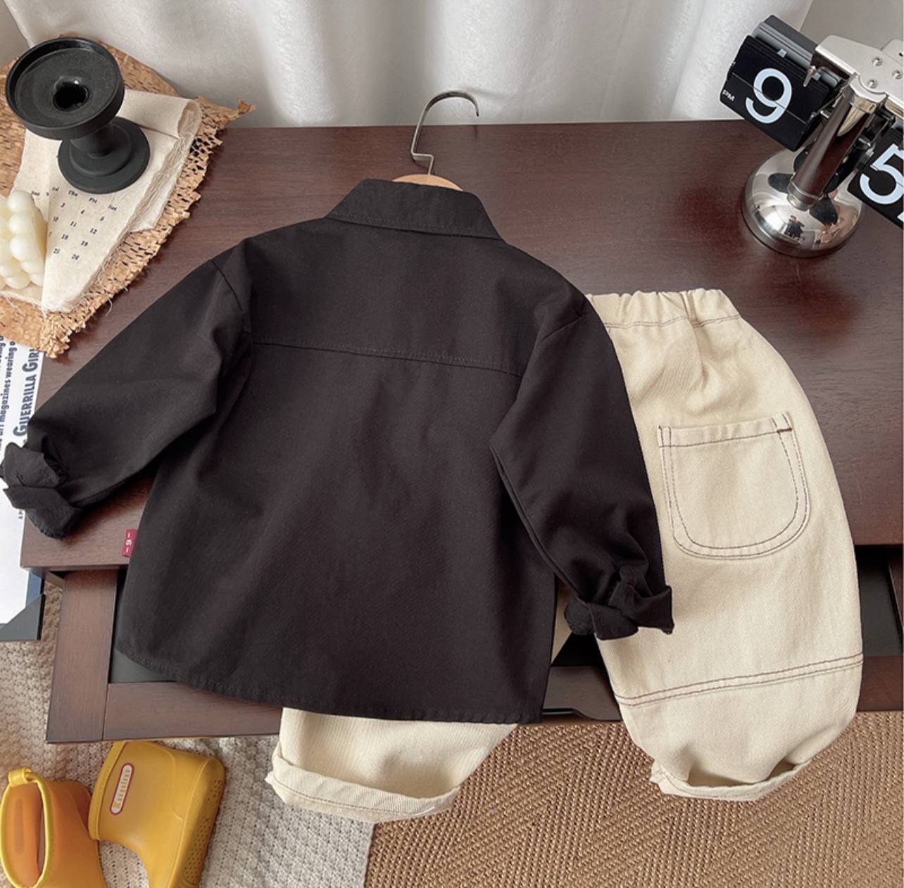 ست پسرانه بسیار شیک و مینیمال شامل پیراهن یقه دار دکمه ای با جیب سفید و شلوار کرم روشن با کمر کشی . ترکیب رنگ خنثی و طراحی ساده این ست ، آن را به انتخابی عالی برای مهمانی ها ، عکاسی ، عید دیدنی و استایل های رسمی و نیمه رسمی تبدیل کرده است.